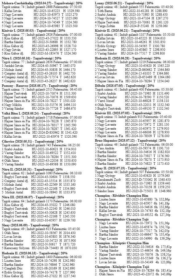 Egyesület: Leadott darabszám: Leosztott ketrecszám: S04 840 db 28 db S05 600 db 20 db S06 1150 db 39 db S07 450 db 15 db S08 200 db 7 db Összesen: 3240 db 108 db Kérem, ha valahol változás történt azt 2025. 08. 12-ig jelezni szíveskedjék, mindenki Bartha Sándor részére mivel a ketrec költséget nagyban befolyásolja néhány ketrecért plusz utánfutó elindítása vagy az autó nem teljes ketreclétszámának megváltása! A fiatalok versenyének költség számítása a Gyöngyösi edzőút érkezési napját követő napon történő létszám leadása után fog megtörténni, tehát a versenyre küldendő fiatalok létszám leadása a jelenleg kiírt edzőprogram tartása esetén 2025. 08. 26!